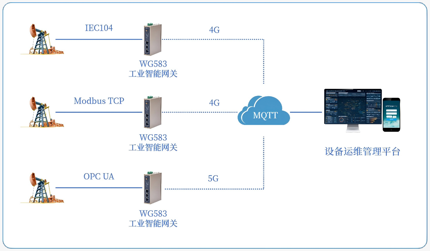 WG583網(wǎng)關(guān)支持邊緣側(cè)數(shù)據(jù)預(yù)處理,過濾無效數(shù)據(jù)并進行標(biāo)準(zhǔn)化轉(zhuǎn)換,隨后以5G/4G網(wǎng)絡(luò)通過輕量級MQTT物聯(lián)網(wǎng)協(xié)議進行數(shù)據(jù)對接到智慧油田管理平臺中,通過多網(wǎng)互備、斷網(wǎng)重連、斷點續(xù)傳、安全加密等多種功能,保障數(shù)據(jù)安全完整傳輸。
